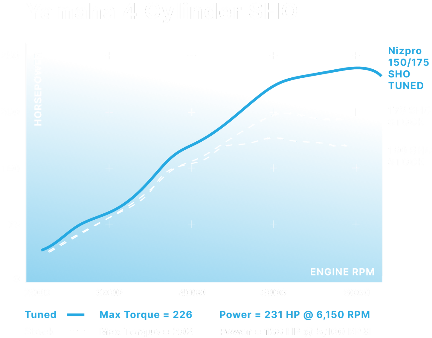With the Nizpro performance tune, your 150 or 175-horsepower Yamaha outboard engine can increase to a 231hp monster. You will experience a substantial increase in low-end and mid-range torque torque to get you up on plane quicker, and depending on your setup, an increase of 2-5mph in top speed.